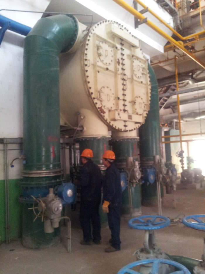 二、反沖洗旋轉(zhuǎn)導(dǎo)流濾網(wǎng)產(chǎn)品特點(diǎn) 目前各電廠凝汽器循環(huán)水系統(tǒng)中較為普遍使用的固定式和旋轉(zhuǎn)式兩種二次濾網(wǎng),通過(guò)多年來(lái)運(yùn)行實(shí)踐證明,主要存在以下幾點(diǎn)問(wèn)題: 1 、 固定式的特點(diǎn): 網(wǎng)芯固定不能旋轉(zhuǎn),清理污物效果差,網(wǎng)孔易堵塞,清理要等待停機(jī)。 2 、 反沖洗旋轉(zhuǎn)導(dǎo)流濾網(wǎng)旋轉(zhuǎn)式特點(diǎn): 網(wǎng)芯旋轉(zhuǎn)、清洗時(shí)靠負(fù)壓反沖,該濾網(wǎng)清污能力強(qiáng),但是當(dāng)洪峰季節(jié)貨水污較嚴(yán)重時(shí),以及水中含塑料薄膜。雜草等粘俯力較強(qiáng)的污物時(shí),清洗效果仍不理想,如遇排污室刮板磨損嚴(yán)重時(shí),清污效果更差,現(xiàn)在進(jìn)行結(jié)構(gòu)升級(jí)另行設(shè)計(jì)加裝上旋轉(zhuǎn)導(dǎo)流。 (1)驅(qū)動(dòng)網(wǎng)芯的一對(duì)齒輪采用不銹鋼材料制作,經(jīng)久耐用,保證凝汽器安全和經(jīng)濟(jì)運(yùn)行。 (2)傳動(dòng)系統(tǒng)釆用擺線增輪減速機(jī),按每分鐘8轉(zhuǎn)運(yùn)行。 (3)運(yùn)行安全可靠,檢修維護(hù)方便。 三、反沖洗旋轉(zhuǎn)導(dǎo)流濾網(wǎng)結(jié)構(gòu)形式和工作原理 電動(dòng)旋轉(zhuǎn)反沖式二次濾網(wǎng)結(jié)構(gòu)形式如附圖,它主要由:①殼體②不銹鋼網(wǎng)芯③傳動(dòng)機(jī)構(gòu)④減速機(jī)⑤強(qiáng)排污裝置⑥自動(dòng)導(dǎo)流器⑦放氣閥⑧電動(dòng)排污閥⑨PLC控制箱等部件組成。 工作原理:經(jīng)過(guò)攔污柵和一次濾網(wǎng)過(guò)濾的循環(huán)水中仍含有不少懸浮物和泥沙等雜質(zhì),經(jīng)過(guò)循環(huán)水泵進(jìn)入二次濾網(wǎng)再過(guò)濾,當(dāng)水中懸浮物和泥沙等雜質(zhì)在濾網(wǎng)處附到一定數(shù)量時(shí),濾網(wǎng)的內(nèi)外水壓差增大到控制系統(tǒng)規(guī)定數(shù)值時(shí)(一般為500mmH2O柱),啟動(dòng)控制系統(tǒng)動(dòng)用、排污機(jī)構(gòu)投入工作,將附著物排出二次濾網(wǎng),待內(nèi)處壓差恢復(fù)到正常時(shí)(一般≤400mmH2O柱)控制機(jī)構(gòu)關(guān)閉、循環(huán)往復(fù),從而完成過(guò)濾排污工作過(guò)程。