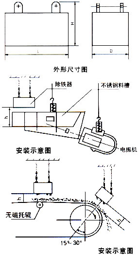 簡述: 懸掛式永磁除鐵器內(nèi)部采用高矯頑力,高剩磁的特殊永磁體“釹鐵硼”等材料組成復(fù)合磁系。具有免維護(hù)、磁力強(qiáng)、壽命長、安裝簡單、使用方便、運(yùn)行可靠等特點,適用于皮帶機(jī)、振動輸送機(jī)、電磁振動給料機(jī)、下料溜槽上的非磁性物料中除鐵。清除0.1~35公斤的鐵磁性物質(zhì),內(nèi)部永磁磁系使用壽命10年以上。該產(chǎn)品各項技術(shù)指標(biāo)符合JB/T8711--1998標(biāo)準(zhǔn)。 當(dāng)永磁鐵吸附鐵磁物較多時,人工用非磁性刮板清除或戴手套摘除,適用于連續(xù)工作,含鐵較少的場合。 適用范圍: 適合沒有輸送皮帶,物料中含鐵較少且只能提供下料溜槽的場合。主要應(yīng)用于水泥、化工、煤炭、塑料、耐火材料、建材等行業(yè)的下料管道中清除雜物。技術(shù)特點:聚磁復(fù)合磁第,雙磁極結(jié)構(gòu),弱場強(qiáng)度高,吸力大。磁極吸附面積大,保障有足夠時間從運(yùn)行物料中吸起鐵雜物。管道為全密封結(jié)構(gòu),除鐵器外置安裝,避免長期連續(xù)使用使除鐵器磨損。體積小,重量輕,安裝方便,除鐵干凈,維護(hù)簡單。