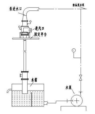 五:射水抽氣器安裝: 由于大中小型機(jī)組各有一定的特點(diǎn),為了簡化系統(tǒng)并降低空氣母管的高度,一般12MW以上機(jī)組 射水抽汽器須備用一臺水泵,射水抽汽器有兩種供水方式: